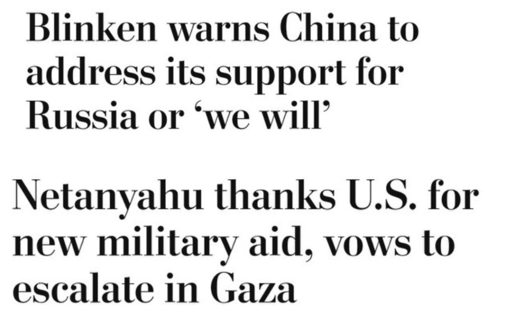 USA fortsätter se sig själva som en världspolis trots att de inte längre har monopol på världsherraväldet, men hur trovärdigt är det att landets utrikesminister Antony Blinken åker till Kina för att läxa upp dem för sitt stöd till Ryssland när USA själva samtidigt finansierar såväl kriget i Ukraina som Israels framfart i Gaza?