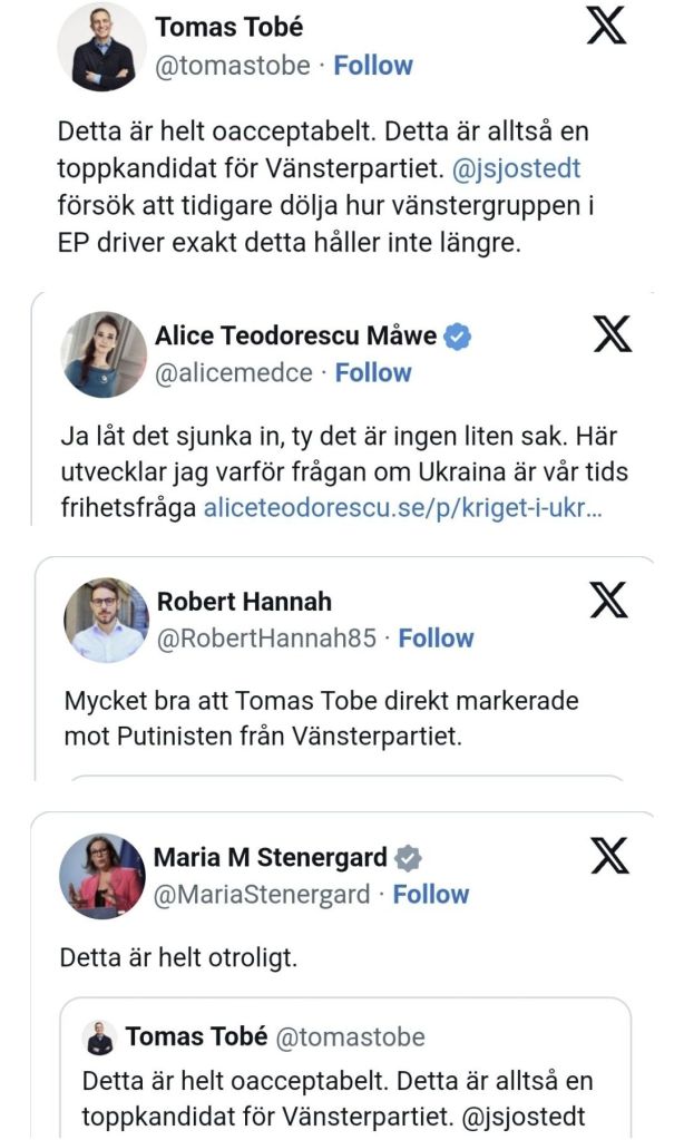 Även på X var det flera kända politiker som dundrade mot ”putinisten” i Vänsterpartiet och ”idiotin” att uppmana till en fredlig lösning på konflikten – bland annat Maria Malmer Stengard (M), Alice Teodorescu Måwe (KD) och Robert Hannah (L).
