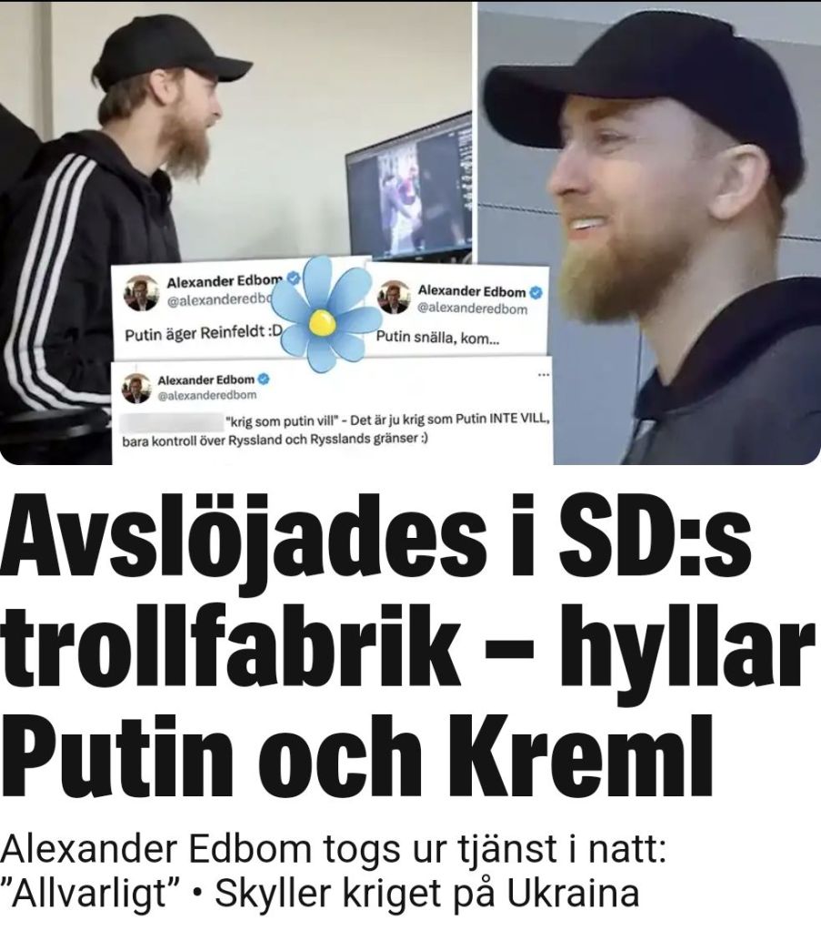 Se där ja, efter att Sverigedemokraterna hamnat i blåsväder efter Kalla Faktas reportage om deras ”trollkonton” hittade man någon som kunde bära hundhuvudet. Alexander Edbom pekas nu ut som en central person som under flera år har hyllat Putin, spridit ”ryssvänlig” agenda och skyllt kriget på Ukraina. Så till följd av avslöjandet tog Sverigedemokraterna Edbom ur tjänst i natt och startar en intern utredning – det vill säga Edbom plockas bort likt många andra obekväma röster i partiets historia.