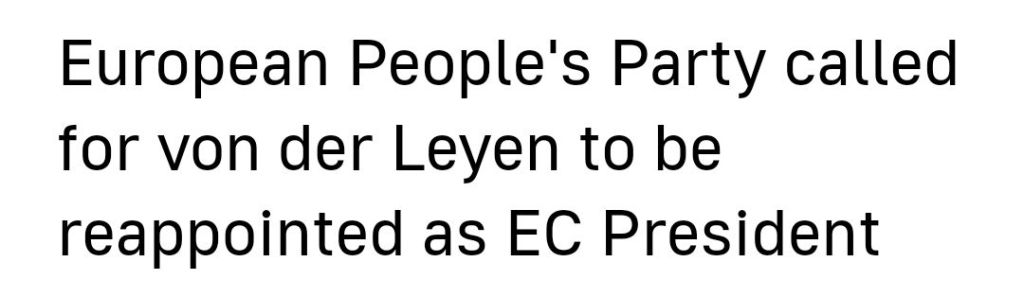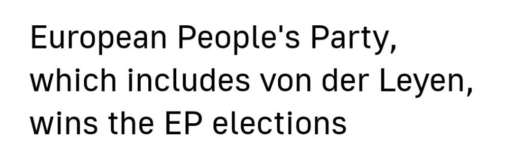 European People’s Party (EPP), där EU-kommissionens ordförande Ursula von der Leyen ingår tillsammans med bland annat Moderaterna, vann valet till Europaparlamentet med stor marginal och kommer tilldelas 189 av 720 platser samt förbättrar därmed sin ställning. Partiet kräver nu att den korrupta Ursula von der Leyen ånyo ska utnämnas till chef för EU-kommissionen för de kommande fem åren. Von der Leyen har redan sagt att hon ska upprätta en barriär för höger- och vänsterextremister.