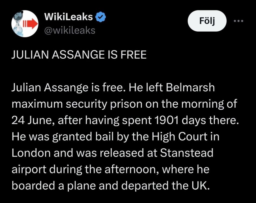 Mitt bland alla deprimerande nyheter kommer det ett guldkorn – frihetskämpen Julian Assange har äntligen släppts fri! 🥳