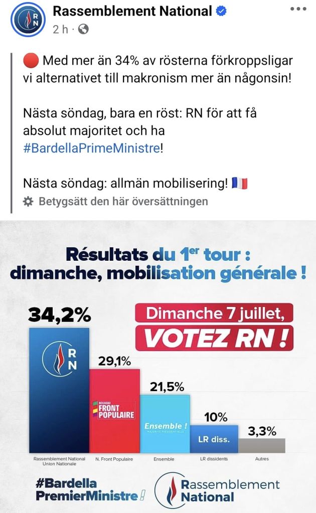 Det franska valresultatet efter första omgången ger lovande vibbar inför nästa vecka och det franska folket motsätter sig tydligt etablissemanget! 👍
