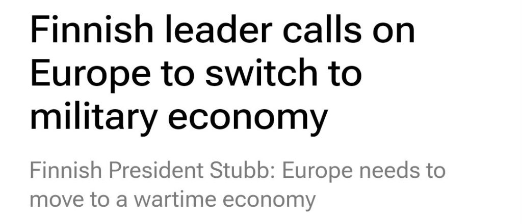 När den finske presidenten Alexander Stubb intervjuades av Bloomberg i går, deklarerade han att Europa måste gå över till en ”krigstidsekonomi”.