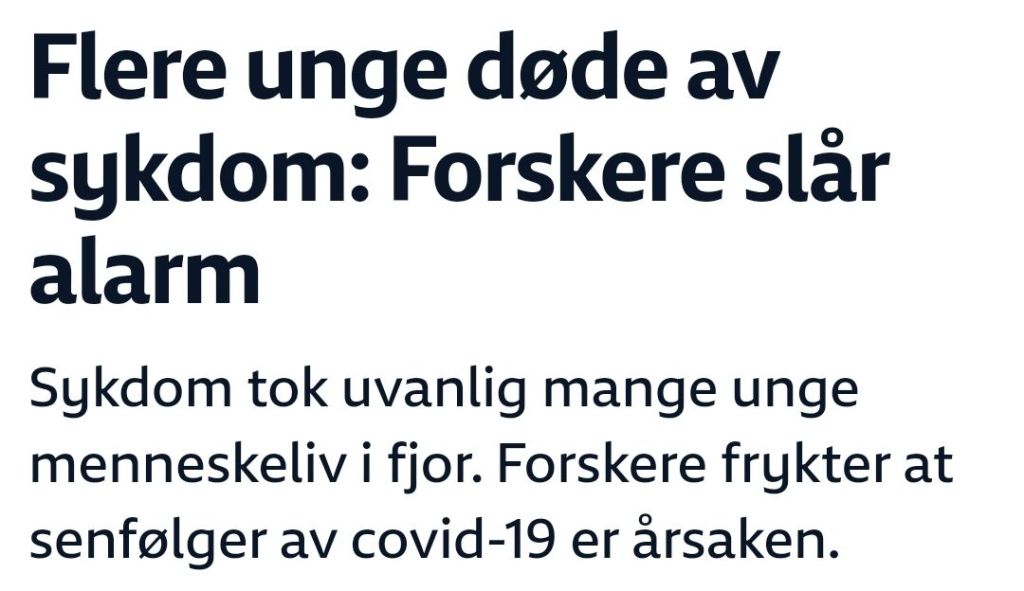 År 2023 dog 378 norrmän i åldern 1 till 39 år av sjukdom, en överdödlighet på över 50% jämfört med utvecklingen under perioden 2010 till 2019. Sjukdomar som cancer samt hjärt- och kärlsjukdomar krävde fler liv än väntat, men den största ökningen kom i kategorin ”alla andra sjukdomar” där ”andra symtom och odefinierade tillstånd” – det vill säga saker som de saknar svar på – dominerar.