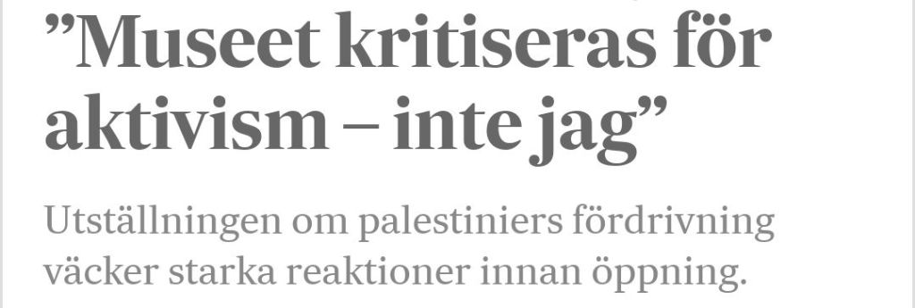 Intressant i sammanhanget är att Medelhavsmuseet i Stockholm visar utställningen ”Nakba, palestinska berättelser från 1948”, vilken mötts av stark kritik och motstånd även från politiskt håll bara för att den inte passar det pro-israeliska narrativet.