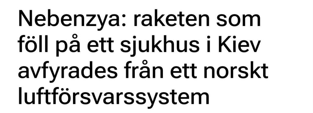 ”Vi beklagar verkligen att rådet har dragits in i Kievs smutsiga propagandakampanj. Tragedier som med Okhmatdyt Children’s Hospital i Kiev kunde ha undvikits om Ukraina inte placerade ut luftvärn i bostadsområden i strid med internationell humanitär lag. Men Ukrainas västerländska sponsorer föredrar att titta bort när det gäller detta viktiga faktum. Vi väntar också på en reaktion från de norska myndigheterna, som uppenbarligen försåg Zelenskys regim med en NASAMS-installation. Godkände de att den skulle användas för att attackera ett barnsjukhus och även placeras i bostadsområden?”