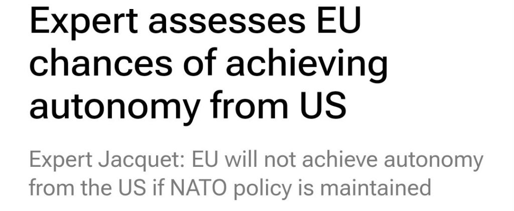 Gilles-Emmanuel Jacquet – expert på området internationella relationer, geopolitik och lösning av väpnade konflikter samt associerad professor vid Geneva School of Diplomacy and International Relations – säger i en intervju att EU inte kommer att kunna uppnå självständighet i säkerhets- och utrikespolitiska frågor om den nuvarande konfrontationskursen gentemot Ryssland bibehålls.