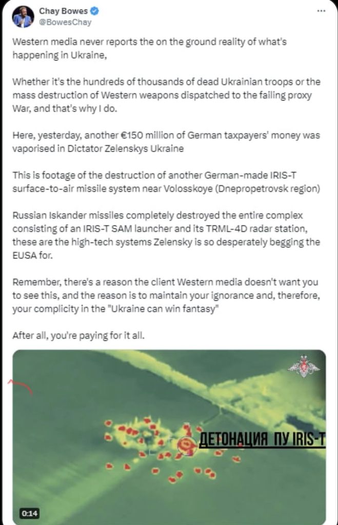 Här, i går, förångades ytterligare 150 miljoner euro av tyska skattebetalares pengar i diktator Zelenskys Ukraina. Det här är filmer från förstörelsen av ännu ett tysktillverkat IRIS-T mark-till-luft-missilsystem nära Volosskoye (Dnepropetrovsk-regionen). Ryska Iskander-missiler förstörde fullständigt hela komplexet bestående av en IRIS-T SAM-raket och dess TRML-4D radarstation. Det är dessa högteknologiska systemen som Zelensky så desperat tigger EUSA om.