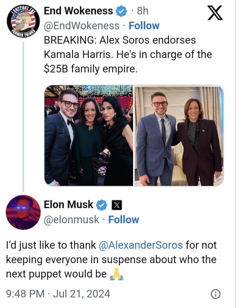 Även Elon Musk framförde kritik rörande valet av Harris och när Alex Soros, son till miljardärsfinansmannen George Soros, beskrev Harris som demokraternas bästa vapen för att besegra Donald Trump, tackade Musk för att Soros så snabbt påvisade att Harris är nästa ”puppet”.