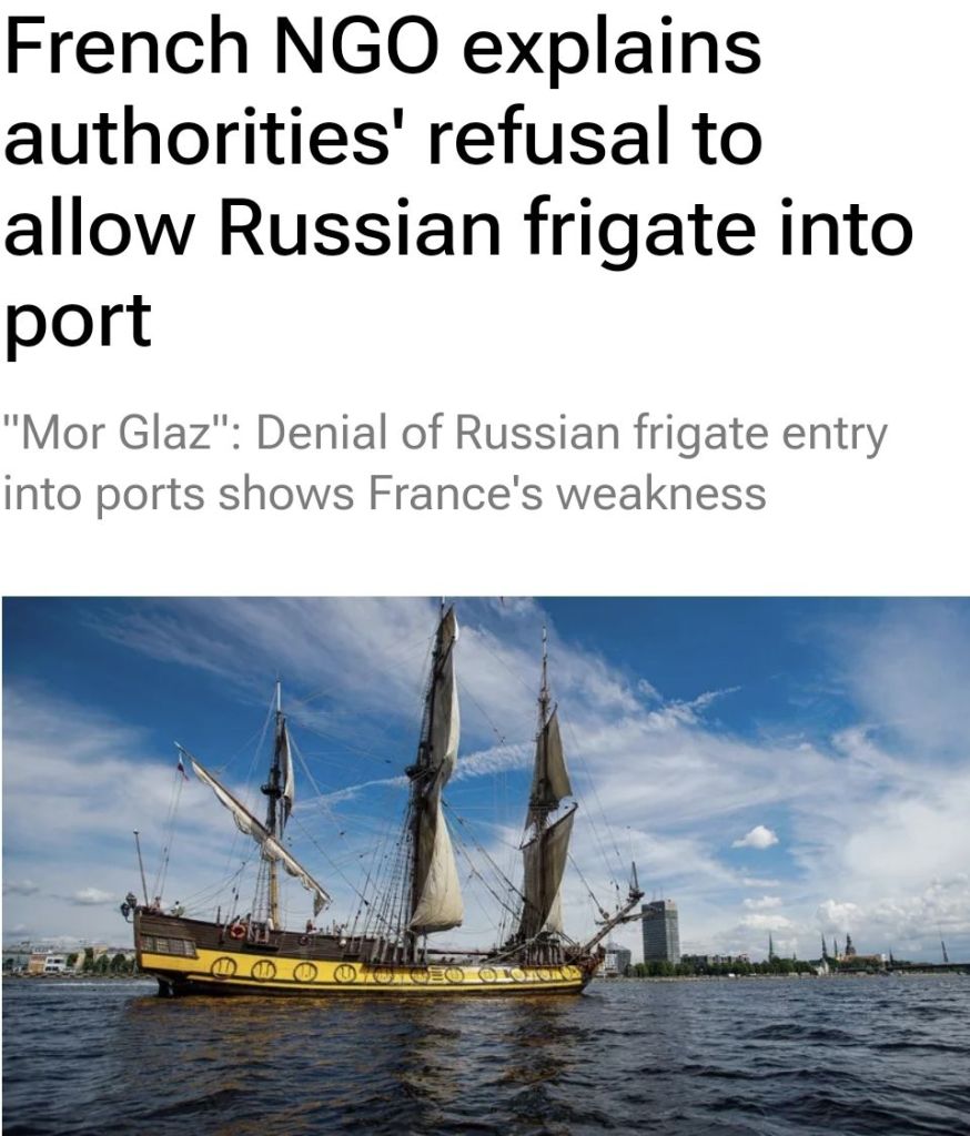 Shtandart, en kopia av tsar Peter den stores fregatt, seglas av en multinationell besättning på 17 sjömän från Ryssland, Frankrike, Spanien, Holland, Belgien, USA, England och Israel. Tidigare har prefekturen för Finisterre-departementet i västra Frankrike förbjudit fregatten att komma in i hamnar efter att EU:s sanktioner mot Moskva lagt till formuleringen ”kopior av historiska fartyg”, vilket fregatten är.