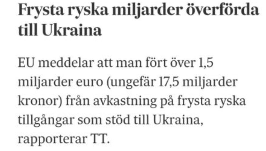 I dag lät EU meddelar att man fört över de första 1,5 miljarder euro som man stulit från frysta ryska tillgångar till mer stöd åt Ukraina, där 90% av pengarna går till en fond för inköp av vapen.