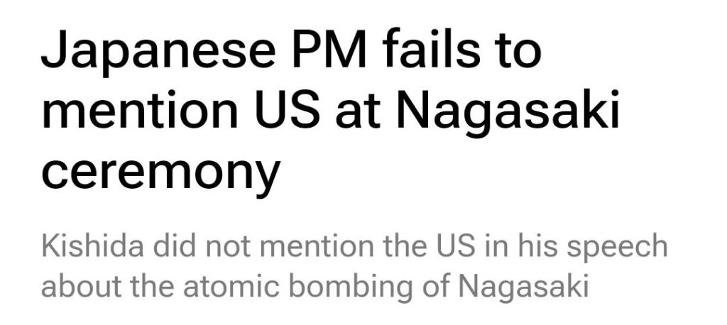 När FN:s generalsekreterare Antonio Guterres läste upp ett meddelande under minneseremonin nämnde han inte USA:s roll i atombombningarna av Hiroshima och Nagasaki. Inte heller Nagasakis borgmästare Shiro Suzuki nämnde USA och när Japans premiärminister Fumio Kishida talade vid en minnesceremoni i Nagasaki betonade han vikten av att förstå korrekt och förmedla sanningen om atombombningarna av japanska städer – utan att tala om USA:s ansvar för tragedin.