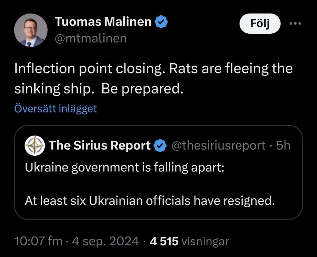 Tuomas Malinen, professor vid Helsingfors universitet och geopolitisk expert, indikerar i ett inlägg på X att slutet närmar sig i Ukrainakonflikten och råttorna börjat lämna skeppet efter att det blev känt att flera ministrar i den ukrainska regeringen avgår.