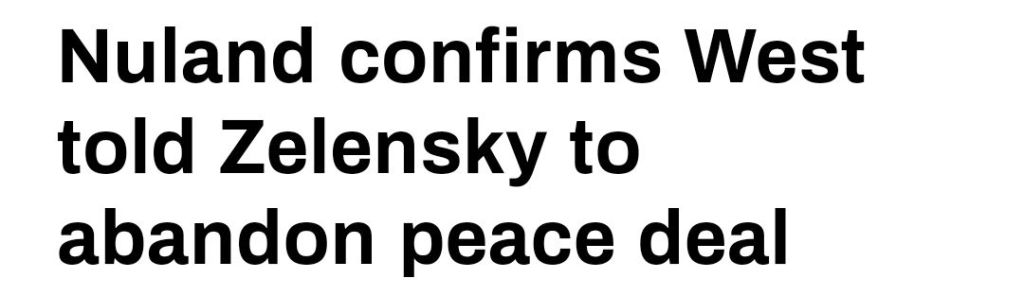 USA:s tidigare vice utrikesminister Victoria Nuland – som spelade en nyckelroll i den våldsamma kuppen i Kiev 2014 med stöd av västerländska supportrar, vilken störtade Ukrainas demokratiskt valda president Viktor Janukovitj och som i ett läckt telefonsamtal sade att EU kan dra åt helvete när planen för hur de skulle styra Ukraina lades upp – har i en intervju med den ryska journalisten Mikhail Zygar (tidigare chefredaktör för den liberala nyhetskanalen Dozhd) som sändes i torsdags, erkänt att USA tillsammans med Storbritannien och andra som stödjer Ukraina beordrat Kiev att förkasta den överenskommelse med Ryssland som nåddes vid fredssamtalen i Istanbul 2022 som innebar att Kiev var villiga att förklara militär neutralitet, begränsa sina väpnade styrkor och lova att inte diskriminera etniska ryssar samtidigt som Ryssland skulle ha anslutit sig till andra ledande makter för att erbjuda Ukraina säkerhetsgarantier.