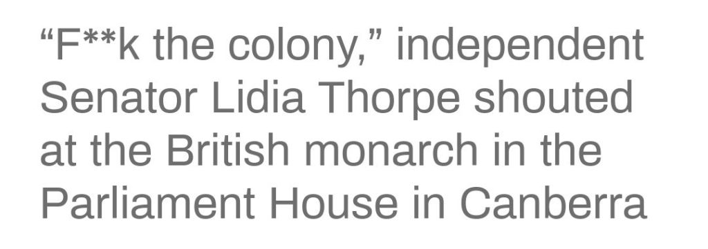 Den oberoende senatorn Lidia Thorpe deltog i dag i en manifestation tillsammans med förespråkare för urfolkssuveränitet utanför Australian War Memorial som besöktes av kungligheterna Storbritanniens kung Charles III och drottning Camilla. När kungaparet senare deltog i en mottagning i parlamentshuset i Canberra, genomförde Thorpe en protestaktion som fångats på video. Iförd en inhemsk pälsmantel krävde hon att ett avtal tas fram mellan staten och ursprungsbefolkningen.