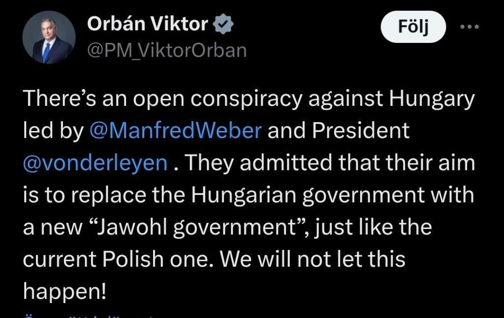 ”Det finns en öppen konspiration mot Ungern ledd av ledaren för Europeiska folkpartiet Manfred Weber och EU-kommissionens president Ursula von der Leyen. De har erkänt att deras mål är att ersätta den ungerska regeringen med en ny ”Jawohl-regering” som t.ex. den nuvarande polska. Vi kommer inte att tillåta detta!