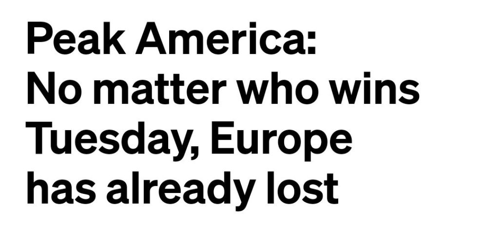 Det sägs att utan USA är Europa förlorat, något som den franske analytikern Nicolas Tenzer skrev förra året och vid en eventuell Trump-seger lär detta sättas på prov. Något som är mycket farligare enligt artikelförfattaren, är dock risken att Europa inte kommer att erkänna att det redan är förlorat och förblir orörligt samt därmed förlamat.