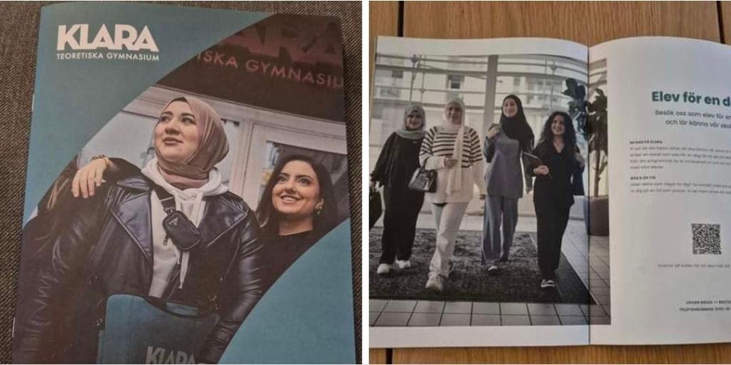 I dag var det en broschyr från KLARA Teoretiska Gymnasium som låg på dörrmattan när jag kom hem. Jag trodde först att det var en internationell skola eller en med religiös inriktning med tanke på framsidan, men man ska inte döma efter omslaget heter det så jag valde att titta igenom innan den åkte i sopnedkastet och även om jag numera verkligen försöker att inte reagera på kvinnor som täcker håret av religiösa skäl, var det ändå omöjligt att inte få det spontana intrycket att man vänder sig till en viss grupp.