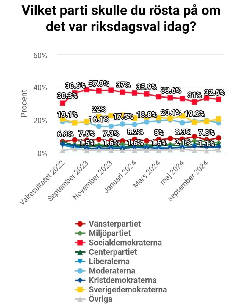 Varken Socialdemokraternas lotteriskandal, Vänsterpartiets tjafs om Gazakonflikten, Moderaternas ständiga krigshets samt ignorans av landets egna interna problem, Sverigedemokraternas bröllopsgästproblem/passivitet kring EU+Nato+DCA+Ukraina/partirepresentanter som vill att USA och Israel anlitas för att likvidera gängkriminella/oförmågan att strypa inflödet av för många asylsökande samt det faktum att de sitter i Moderaternas knä eller övriga partiers ointresse för att hitta ryggraden och stå upp för det egna landet – för att nämna några exempel – kan rucka på opinionen som ligger ganska stabil sedan valet 2022.