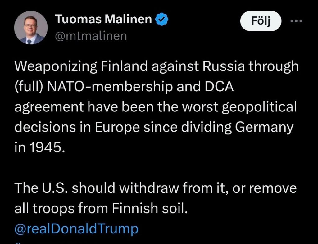 Noterar för övrigt att den finska professorn samt geopolitiska experten vid Helsingfors universitet, Tuomas Malinen, skriver på X att det var ett misstag att ställa Finland mot Ryssland genom att gå med i Nato och han kräver också att alla amerikanska soldater dras tillbaka från landet.
