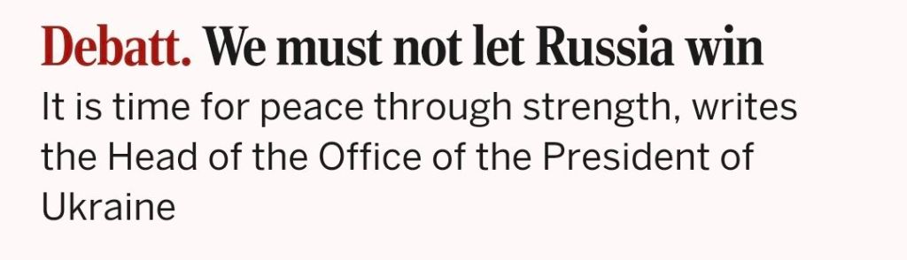I Dagens Industris debattinlägg underskrivet av Andrij Jermak, chef för Ukrainas tidigare president Volodymyr Zelenskys stab, lyser såväl dumheten som bristen på verklighetsförankring tydligt upp i vintermörkret.