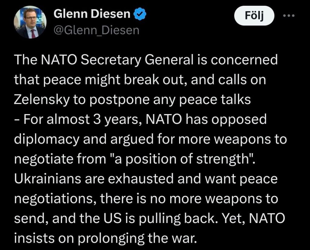 ”Natos generalsekreterare är oroad över utsikterna till fred och uppmanar Zelensky att skjuta upp alla förhandlingar. I nästan tre år har Nato varit emot diplomati och argumenterat för mer vapen för att förhandla från en styrkeposition. Ukrainarna är utmattade och vill ha fredsförhandlingar, det finns inga fler vapen att leverera och USA drar sig ur. Trots det insisterar Nato på att förlänga kriget.”