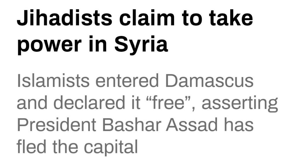 Tydligen förväntas vi återigen tro på att några killar i en pickup med granatgevär tog över ett helt land på några dagar. Det är uppenbart att det är någon form av uppgörelse som har skett och med tanke på Assads snabba avresa kanske även han var med på det. Rykten säger att USA, Storbritannien, Nato, israeler betalat syriska officerare för att lämna sina positioner, så att det knappast kan kallas för ”övertaganden”. En teori är att ryssarna har bytt bort Syrien för Ukraina.