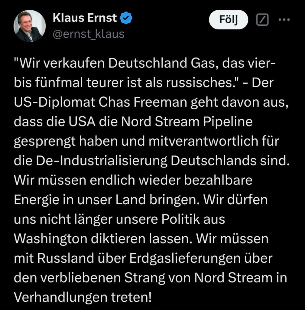 Som Bloomberg rapporterade om tidigare i veckan har analytiker slagit fast att den tyska ekonomin kollapsat under pre-pandemiska nivåer och nu närmar sig ”point of no return”. Även om landets etablissemang likt Sveriges helst undviker att kännas vid problemen och dess orsaker, finns det några friskhetstecken. Nu senast den tyska Bundestagsledamoten Klaus Ernst (Die Linke) som igår skrev på X att Berlin borde inleda förhandlingar med Ryssland om återupptagandet av gasleveranser till Tyskland via den fungerande grenen av Nord Stream 2-gasledningen.
