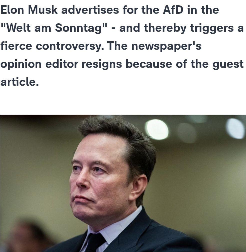 I dag har även den tyska tidningen Welt am Sonntag publicerat en opinionsartikel skriven av Musk där han slår fast att det enda riktiga valet för tyskarna i det kommande valet är högerpartiet Alternative für Deutschland (AfD).