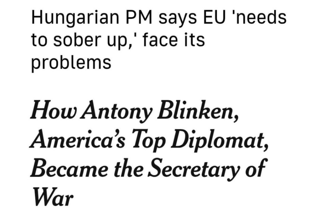 Det är för övrigt intressant att notera att USA:s tidigare utrikesminister Antony Blinken i New York Times tituleras ”Secretary of War” och sågas utmed fotknölarna för sina insatser, inte minst för sin hantering av bland annat Gazakonflikten. Samma Blinken som vasallerna i den svenska regeringen och kungen tilldelade den Kungliga Nordstjärneorden för att ha hjälpt Sverige med inträdet i Nato. Enligt utrikesminister Maria Malmer Stenergard (M) var utmärkelsen ett uttryck för Sveriges tacksamhet över Blinkens insatser. 🤦♀️