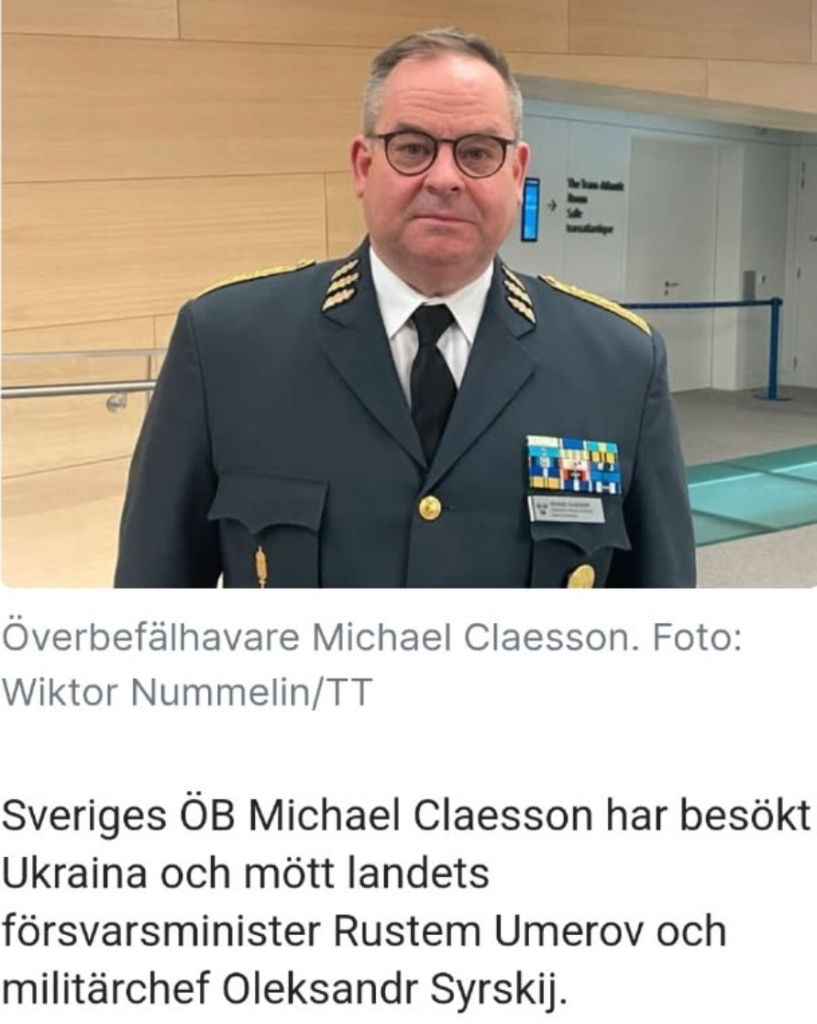 Noterar att ännu en svensk represent besökt Ukraina under brinnande(?) krig. Denna gång Sveriges Överbefälhavare Michael Claesson som i veckan besökte landets försvarsminister Rustem Umerov och militärchef Oleksandr Syrskij, där man