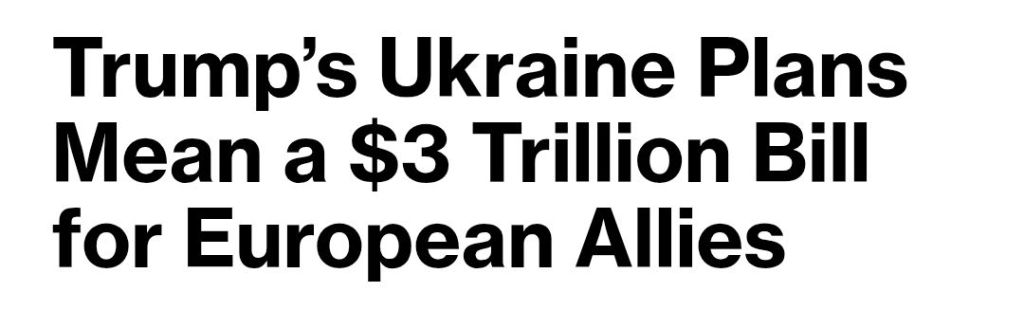 Intressant i sammanhanget är att Bloomberg tittat på vad det skulle kosta EU – som återkommande basunerat ut att de minsann ska fortsätta stödja Ukraina till varje pris oavsett om USA drar sig ur – att fortsätta stödja Ukraina medan medlemsländerna bygger upp sina egna militärer i avsaknad av amerikansk hjälp. Vi talar om extra kostnader på 3,1 biljoner dollar (!) under det kommande decenniet.