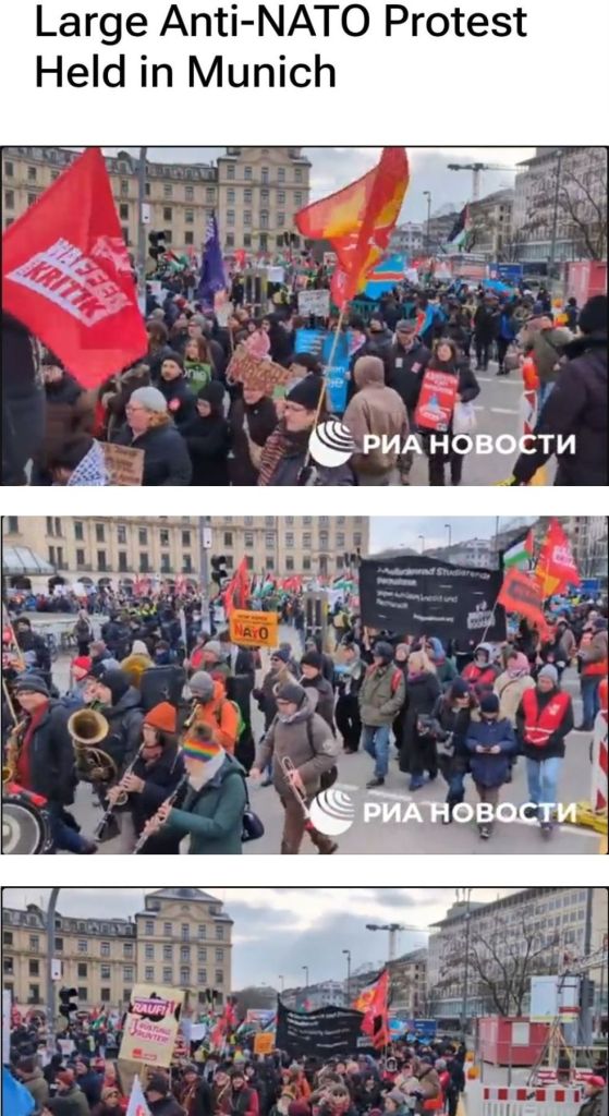 Medan högt uppsatta regeringstjänstemän från olika länder samlats på säkerhetskonferensen i München för att diskutera aktuella ”utmaningar” och problem på det utrikespolitiska området, pågår det en stor demonstration i staden mot Nato.