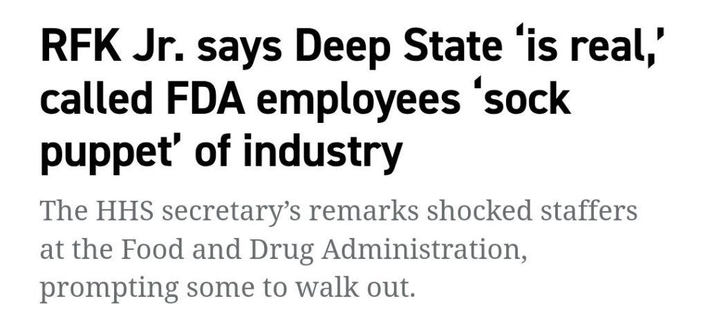 När den amerikanske hälsoministern Robert F Kennedy Jr besökte Food and Drug Administration (FDA) i går och höll ett 40 minuter långt tal till de anställda på myndigheten om den djupa statens förgreningar, blev det för mycket för en del som valde att lämna rummet.