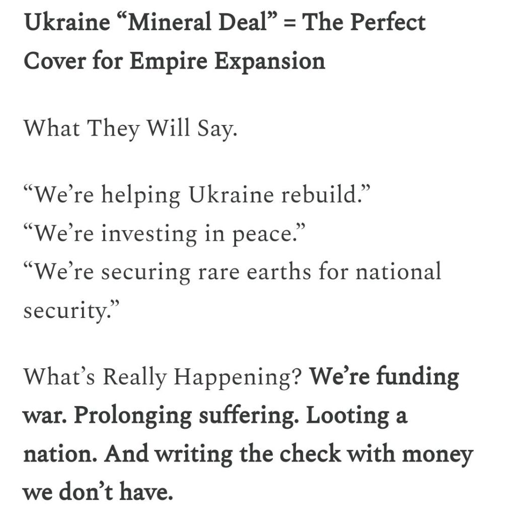 Mineralaffären motiverar fortsatt amerikanskt försvarsstöd, med andra ord mer krig, inte mindre. Det säkerställer en långvarig, öppen konflikt som dränerar vår ekonomi och ger energi till det militärindustriella komplexet.