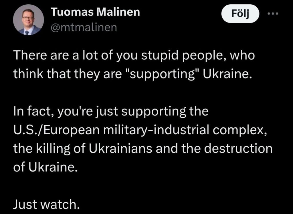 Professor Tuomas Malinen vid Helsingfors universitet skrev om den vansinniga situationen på nätverket X i dag, där han påpekade att de som tror att de stödjer Ukraina i själva verket gör landet en otjänst.