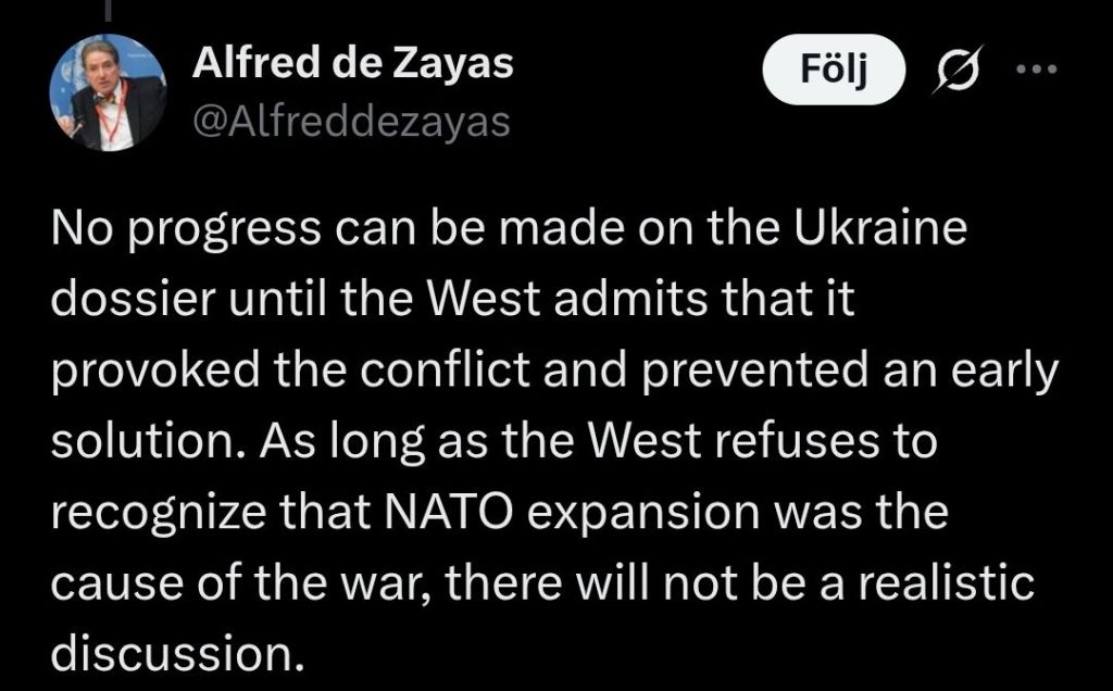 Den amerikanske internationelle advokaten och tidigare oberoende experten för FN:s råd för mänskliga rättigheter, Alfred de Zayas, satte fingret på kärnproblemet i ett inlägg på X i går när han konstaterade att det inte kommer att bli några framsteg i samtalen om Ukraina förrän västländerna erkänner att de provocerade fram den ukrainska konflikten och att dess verkliga orsak var Natos expansion.