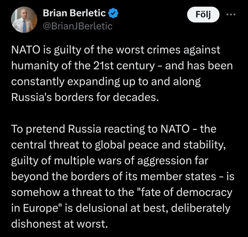 Noterar att den amerikanske militäranalytikern och tidigare marinsoldaten Brian Berletic med rätta kritiserar Nato i ett inlägg på X där han konstaterar att Nato är den främsta orsaken till globala konflikter och instabilitet.