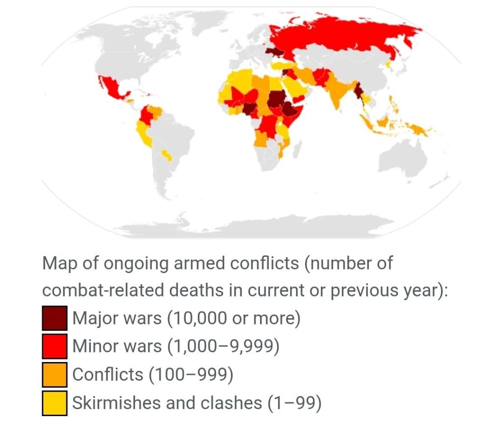 Ett axplock är Myanmar (Asien) sedan 1948, Maghreb/Sahel (Afrika) sedan 2002, Sudan (Afrika) sedan 2008, Etiopien (Afrika) sedan 2018, Kongo (Afrika) sedan 2004 och Jemen (Asien) sedan 2014.