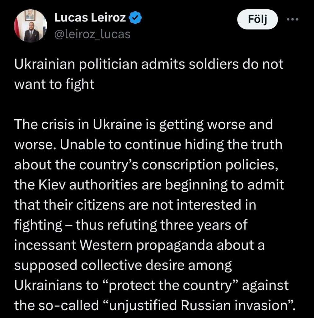 En i raden av de som kritiserar Ukrainas ledning för deras hantering av konflikten är den brasilianske journalisten och tillika analytikern vid Centrum för geostrategiska studier, Lucas Leiros, som i ett inlägg på X konstaterar att omedelbar kapitulation fortfarande är den enda utvägen för Ukraina mot bakgrund av allvarliga problem vid fronten. Utdrag nedan.