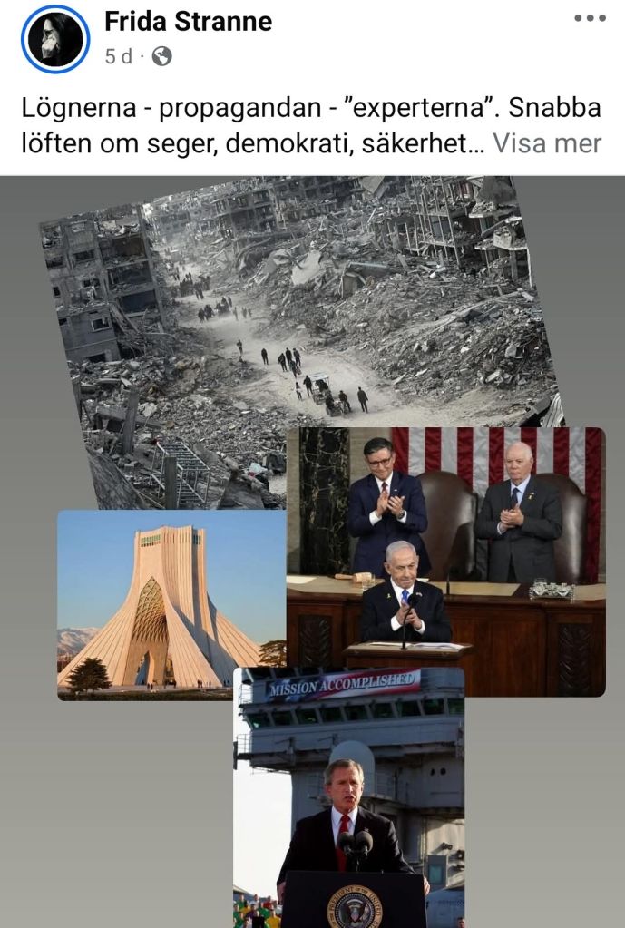 Det stör mig att många drar in iranska kvinnors rätt till frihet i diskussionen om attackerna mot Iran som utförts av Israel och USA, med en indirekt anklagelse om att vi som kritiserar Israel och USA blundar för det förtryck som det iranska folket lever under. Detta är dock två skilda saker enligt min uppfattning. Även om man lider med de kvinnor i Iran som lever i förtryck och inte hade motsatt sig ett fredligt regimskifte, rättfärdigar inte det attackerna som utförts mot landet som strider mot folkrätten enligt såväl folkrättsexperten Ove Bring som Said Mahmoudi, professor emeritus i internationell rätt vid Stockholms universitet (enligt folkrätten har en stat rätt att använda våld mot en annan stat om det är i självförsvar eller om det finns tillstånd från säkerhetsrådet i det här fallet har det inte funnits).