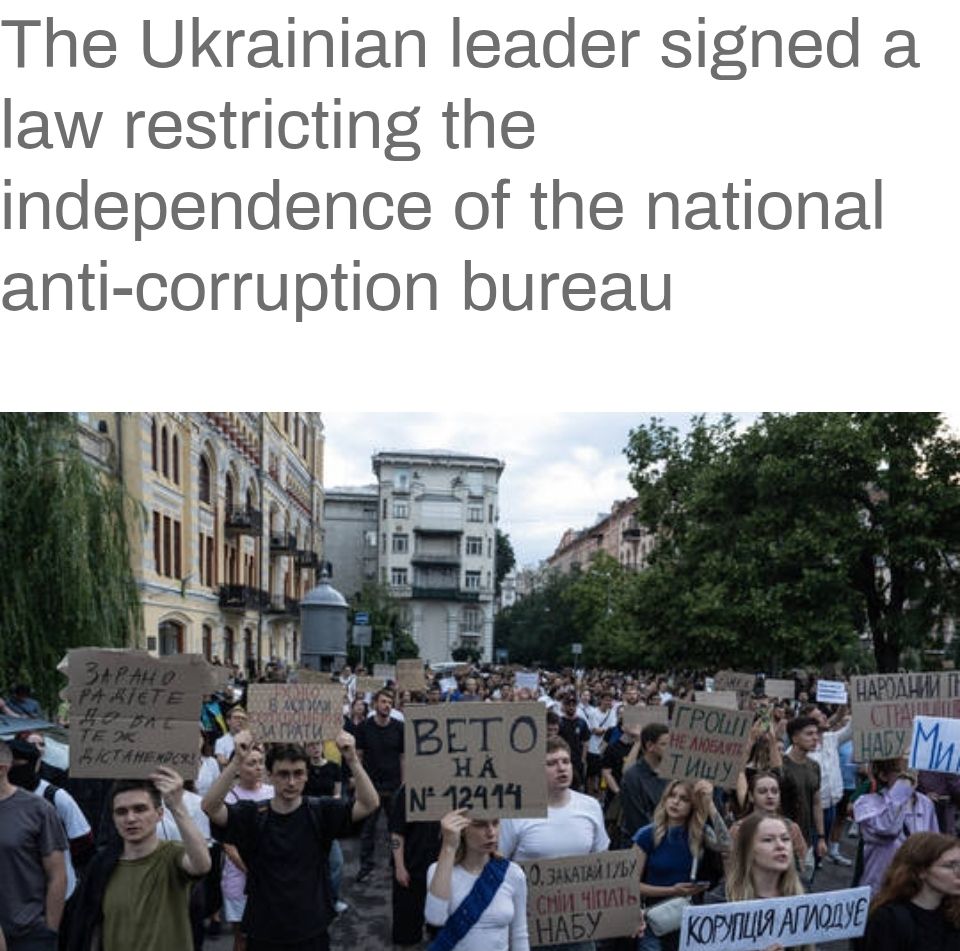Efter att Ukrainas parlament med stor majoritet (263 röster mot 13) i går röstade ja till en kontroversiell ny lag som innebär att Ukrainas nationella korruptionsbyrå (Nabu) och Särskilda åklagarkammaren mot korruption (Sapo) förlorar sitt oberoende samt underställs riksåklagaren som i sin tur tillsätts av presidenten, utbröt stora protester bland befolkningen som under kvällen växte efter att Zelensky skrivit under den nya lagen.