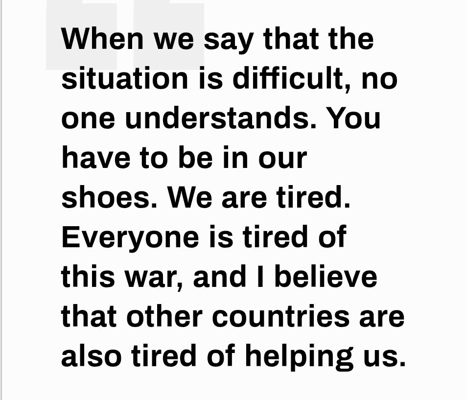 När vi säger att situationen är svår förstår ingen. Man måste vara i våra skor. Vi är trötta. Alla är trötta på det här kriget och jag tror att andra länder också är trötta på att hjälpa oss.”
