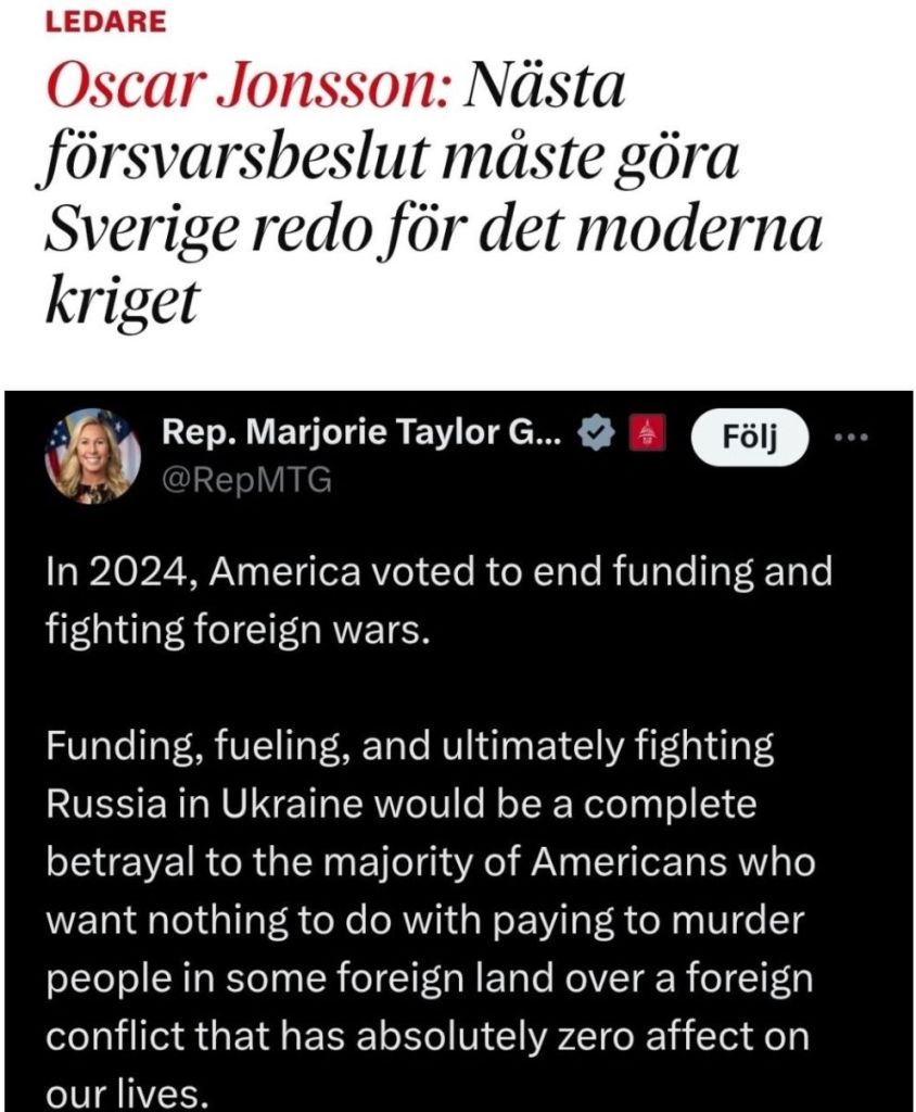 De återkommande utspelen från Washington där president Donald Trump å ena sidan hävdar att han vill att kriget i Ukraina ska upphöra samtidigt som man fortsätter ge militärt stöd till Kiev, har gett många en del huvudbry. Den republikanska kongressledamoten i representanthuset, Marjorie Taylor Greene, framförde i går sund kritik mot dessa dubbla budskap i ett inlägg på X och konstaterade att Washingtonadministrationen sviker amerikanernas intressen samt riskerar att förlora väljarstöd genom att finansiera och underblåsa konflikten i Ukraina.