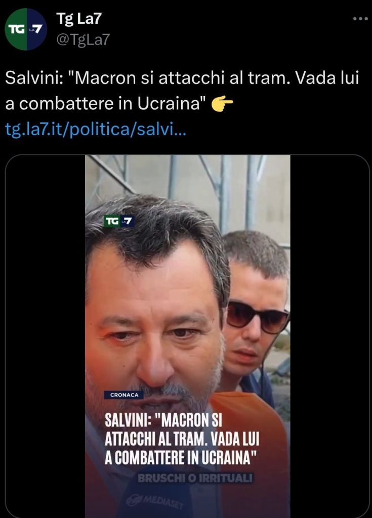 När Salvini kommenterade saken till reportrar i Milano sade han hånfullt att Macron själv borde åka till fronten och strida. å