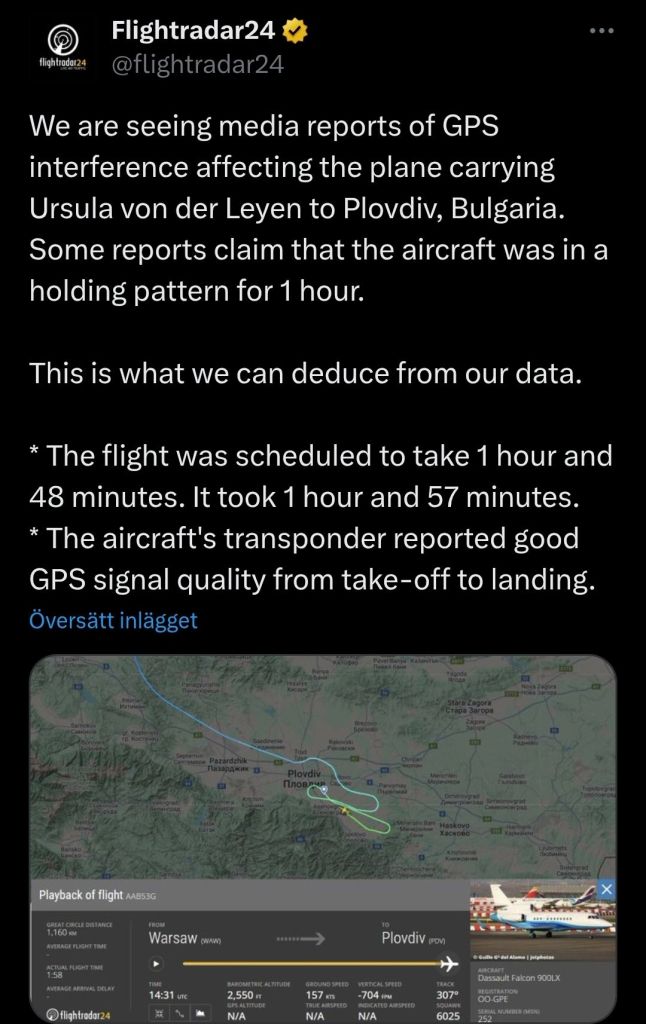 Flygplanet som transporterade von der Leyen till Bulgarien i söndags uppvisade god GPS-signalkvalitet längs hela sin rutt och anlände bara nio minuter senare än planerat. ”Flygplanets transponder rapporterade god GPS-signalkvalitet från start till landning”, rapporterade Flightradar24.