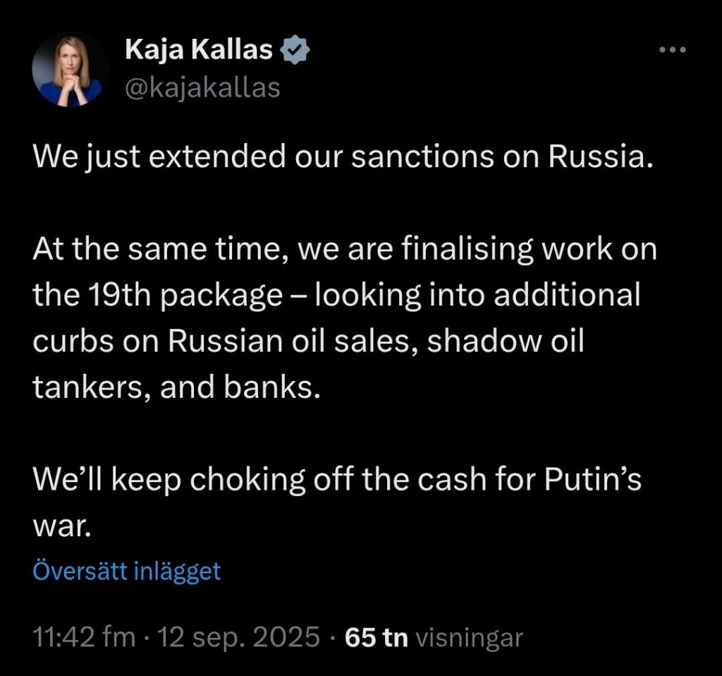 EU-toppen Kaja Kallas meddelade i dag att man förlängt de redan existerande sanktionerna mot Ryssland samt deklarerade att man håller på att slutföra det nya 19:e sanktionspaketet.