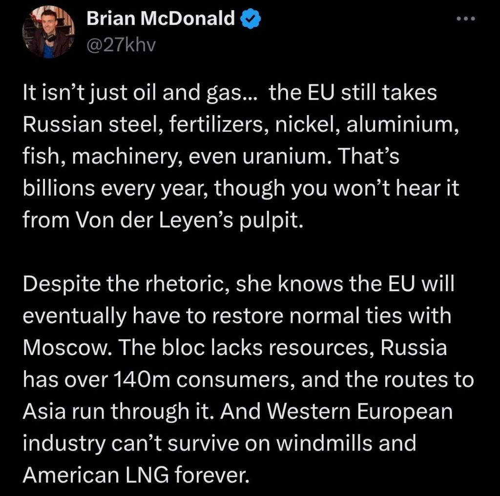 ”Det är inte bara olja och gas … EU tar fortfarande ryskt stål, gödningsmedel, nickel, aluminium, fisk, maskiner, till och med uran. Det är miljarder varje år, även om du inte kommer att höra det från Von der Leyens predikstol. Trots retoriken vet hon att EU så småningom kommer att behöva återställa normala band med Moskva. Blocket saknar resurser, Ryssland har över 140 miljoner konsumenter, och rutterna till Asien går genom det. Och västeuropeisk industri kan inte överleva på vindkraftverk och amerikansk flytande naturgas för alltid.”