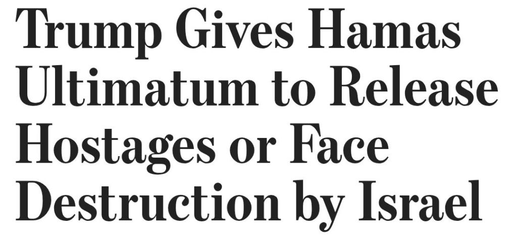 Trump var inte sen att backa upp det hotet och deklarerade att Hamas måste gå med på fredsplanen i 20 punkter inom 72 timmar, eller lida fullständig förintelse.