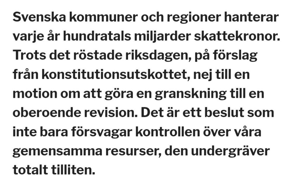 Elena Malmefeldt från partiet Ambition Sverige sätter i en läsvärd artikel fokus på att riksdagen – efter att Konstitutionsutskottet (KU) som egentligen ska vara demokratins väktare valt att avslå motionen – snällt följde efter och sade nej till en oberoende revision av kommunerna trots massiva korruptionsproblem, med hänvisning till att ”kommunalt självstyre är viktigt”.